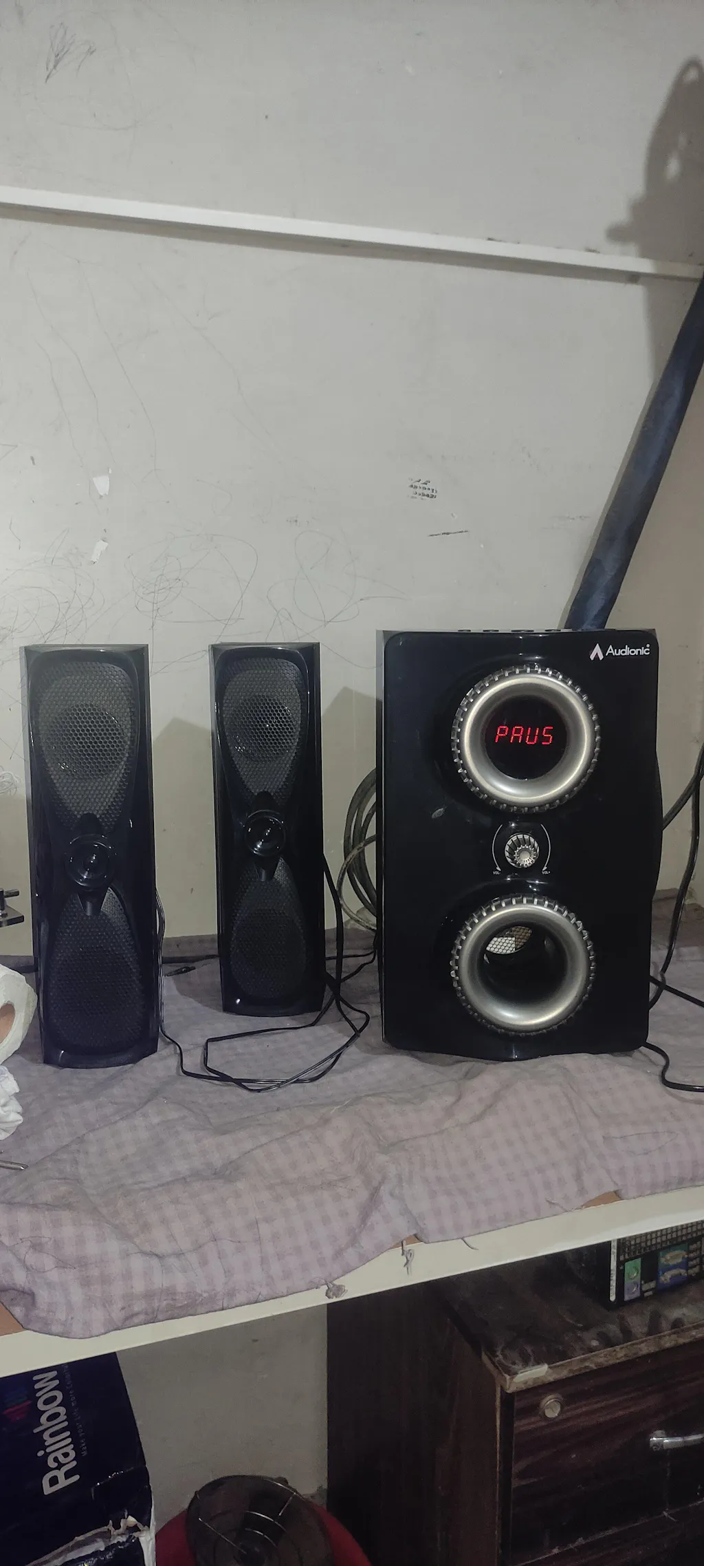How do I connect my Rainbow R-35 speaker to my TV? A: You can connect the system to your TV via an AUX cable. Plug one end into the Audio Output of your TV and the other end into the Audio Input of the Rainbow R-35. If your TV supports Bluetooth, you can also pair the speaker system wirelessly. How do the control the Rainbow R-35 speaker? A: Use the toggle controls on the Rainbow R-35 allow you to adjust volume, toggle between different audio sources, and switch the system on or off. The remote control provides additional controls including Bluetooth pairing and specific audio settings. How do I pair my device via Bluetooth to the Rainbow R-35? On your device, turn on Bluetooth and search for available devices. The Rainbow R-35 should appear in the list. Select it to initiate pairing. If asked for a password, refer to your user manual, but many devices use '0000' or '1234'. How can I achieve the best surround sound with the Rainbow R-35 system? The optimal placement of speakers for surround sound is important. The main subwoofer can be placed near the TV while the satellite speakers should be placed in such manner that the sound is distributed in the room. What can I do if one of my satellite speakers is not working? Check to make sure all connections are secure and the speaker is properly powered. If the problem persists, the speaker may be faulty or the wire may be damaged. Consult your user manual or contact Audionic support. How can I adjust the bass level on the Rainbow R-35 Speaker system? You can adjust the bass level using the remote control. Look for the bass control button and adjust it to your liking. Can I connect multiple devices to my Rainbow R-35 speaker system at the same time? A: Generally, the Rainbow R-35 can only be connected to one audio source at a time. However, you can easily switch between devices by disconnecting the current device and pairing another. What should I do if the sound quality is poor? A: Make sure the audio source is of good quality. Poorly recorded or compressed audio will not sound good on any speaker system. Also, make sure the Rainbow R-35 and the source device's volume are set appropriately - extreme high or low settings can distort sound.